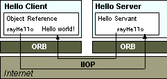 This figure shows how a one-method distributed object is shared between a CORBA client and server to implement the classic "Hello World" application.